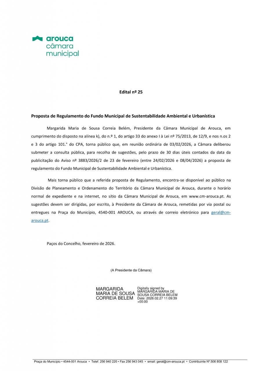 A Junta de Freguesia de Escariz informa que decorre até dia 8 de abril, o período de consulta pública para recolha de sugestões em relação à proposta de Regulamento do Fundo Municipal de Sustentabilidade Ambiental e Urbanística.