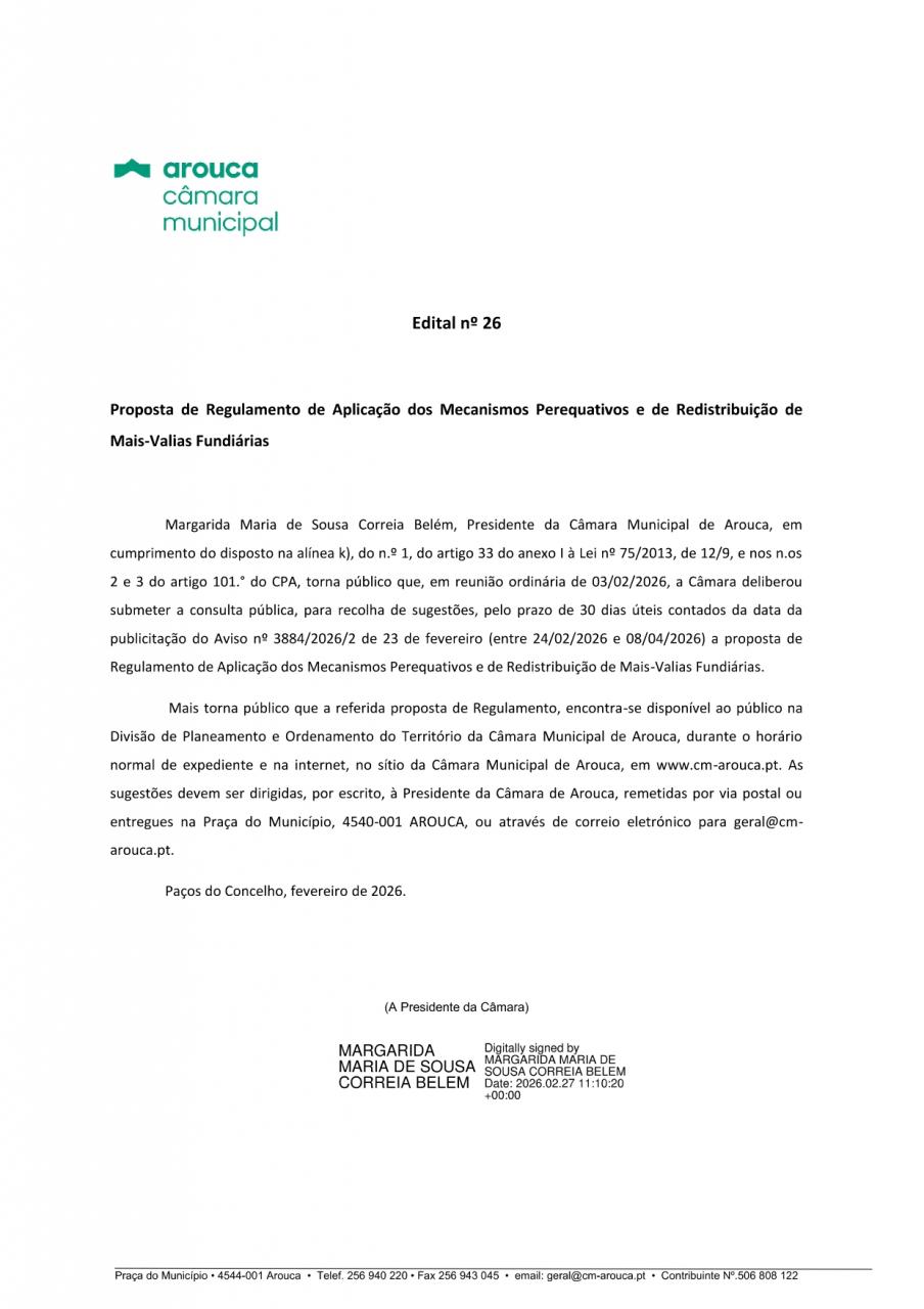 A Junta de Freguesia de Escariz informa que decorre até dia 8 de abril, o período de consulta pública para recolha de sugestões em relação à proposta de Regulamento de Aplicação dos Mecanismos Perequativos e de Redistribuição de Mais-Valias Fundiárias.