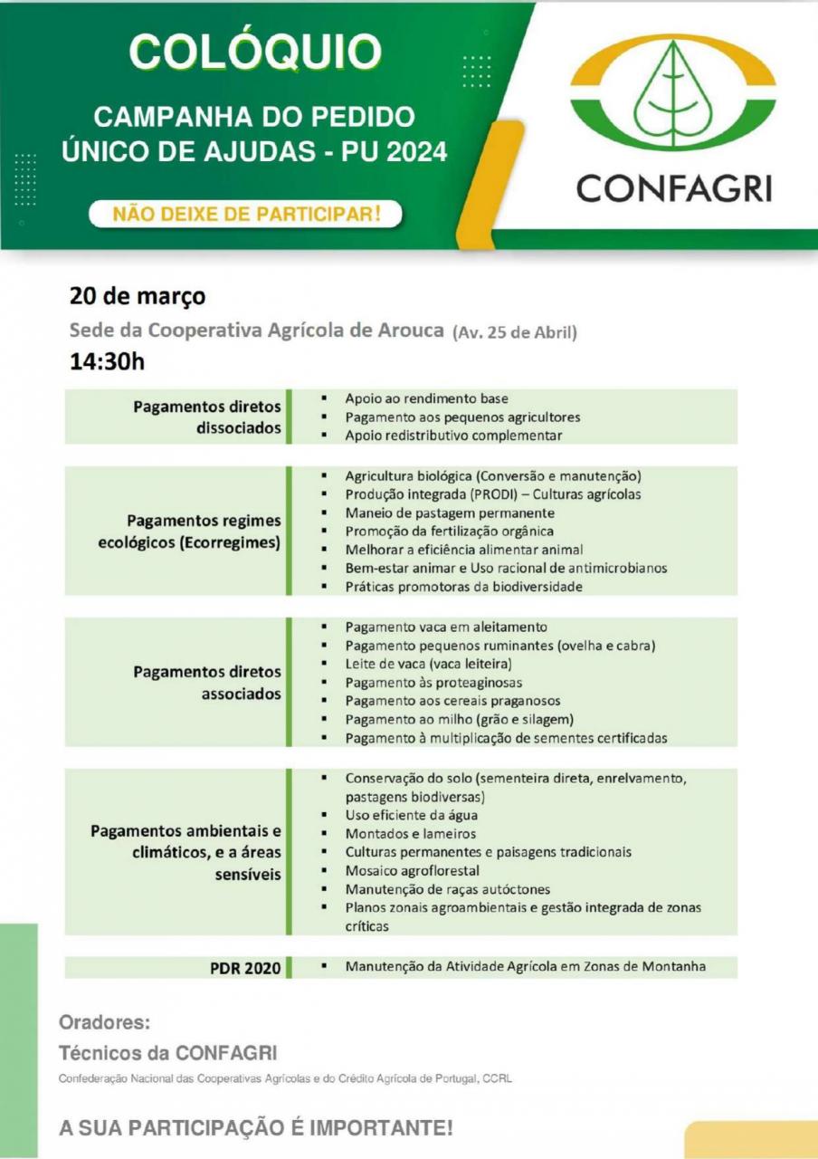 No próximo dia 20 de março, pelas 14:30 horas, na Cooperativa Agrícola de Arouca, realizar-se-á um colóquio de campanha do pedido único de ajudas - PU 2024.