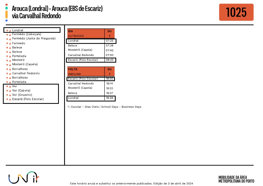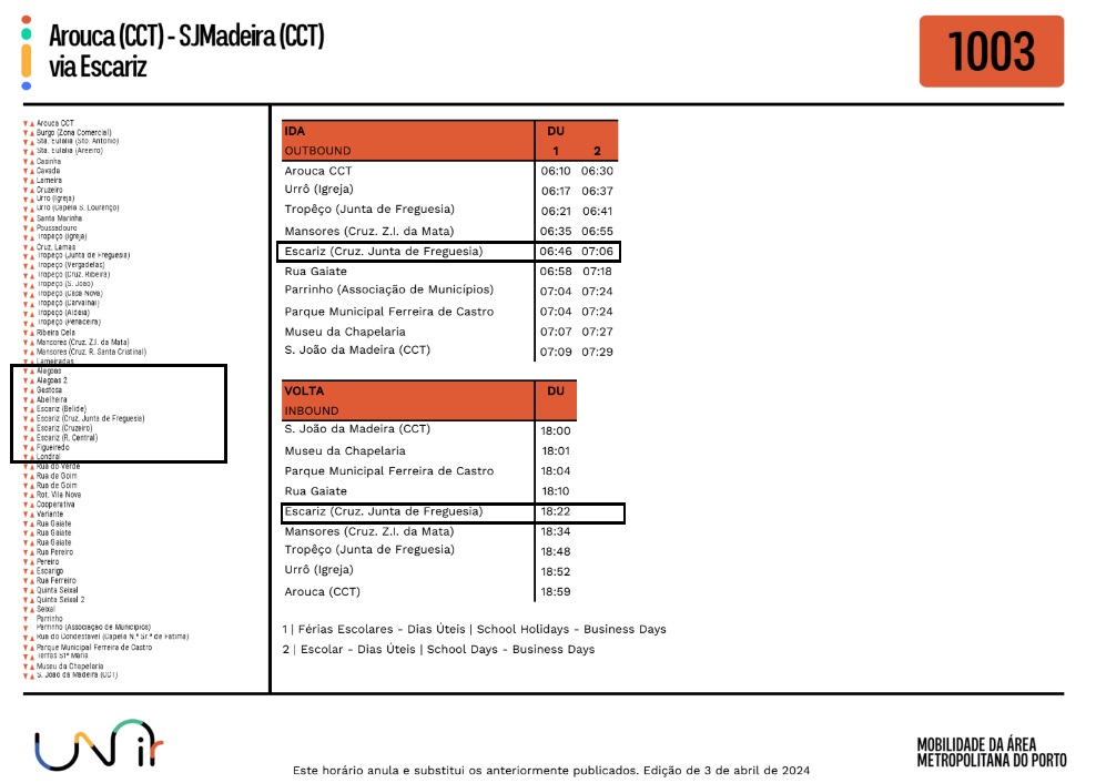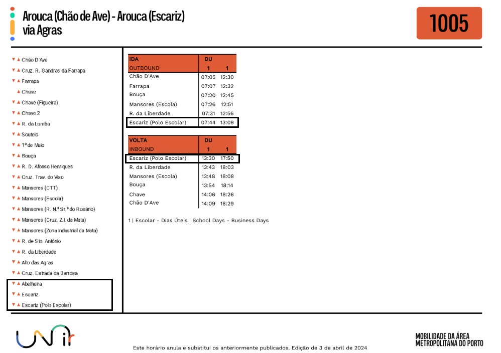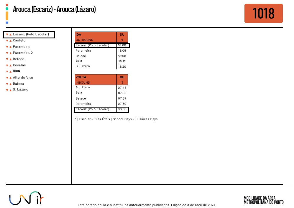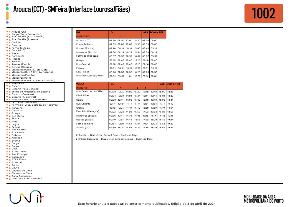 Foram atualizados os horários no Lote 5, da rede Unir, no qual se inclui a Freguesia de Escariz.