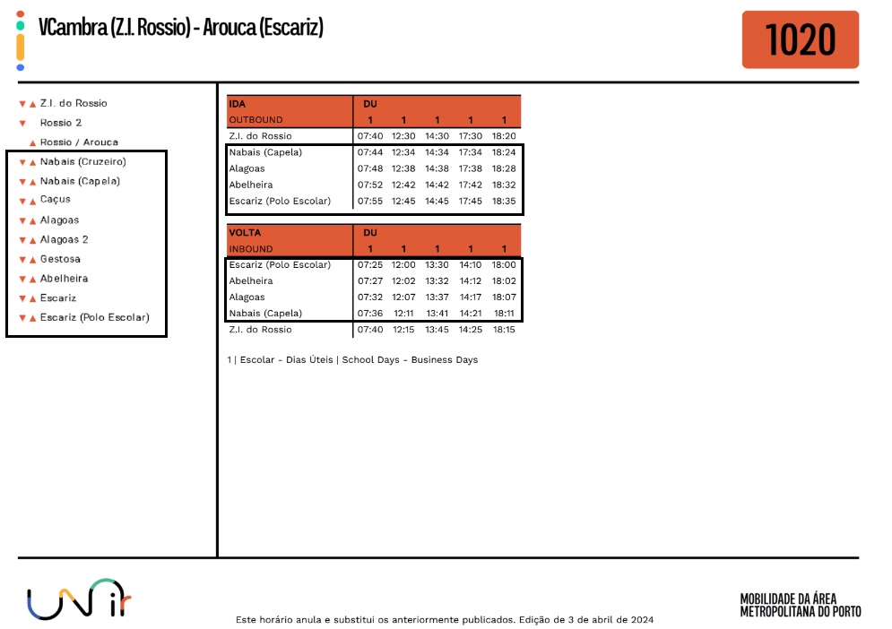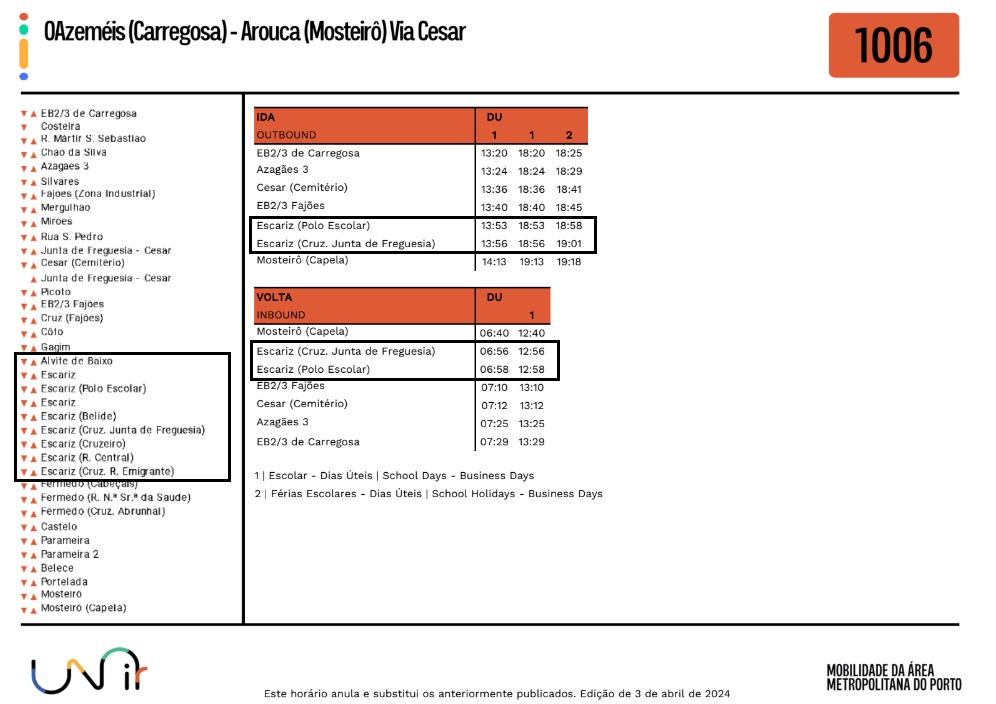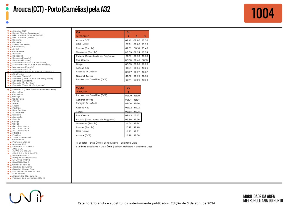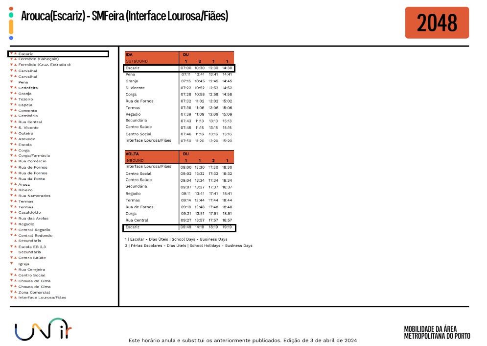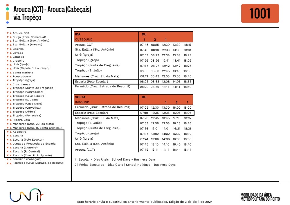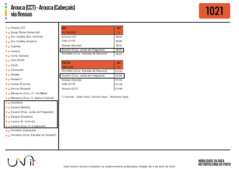 Foram atualizados os horários no Lote 5, da rede Unir, no qual se inclui a Freguesia de Escariz.