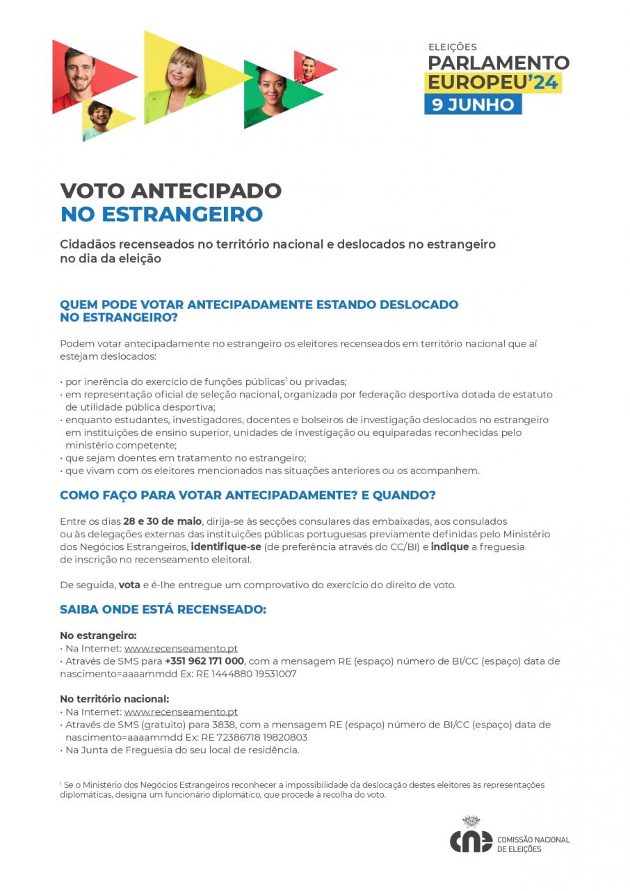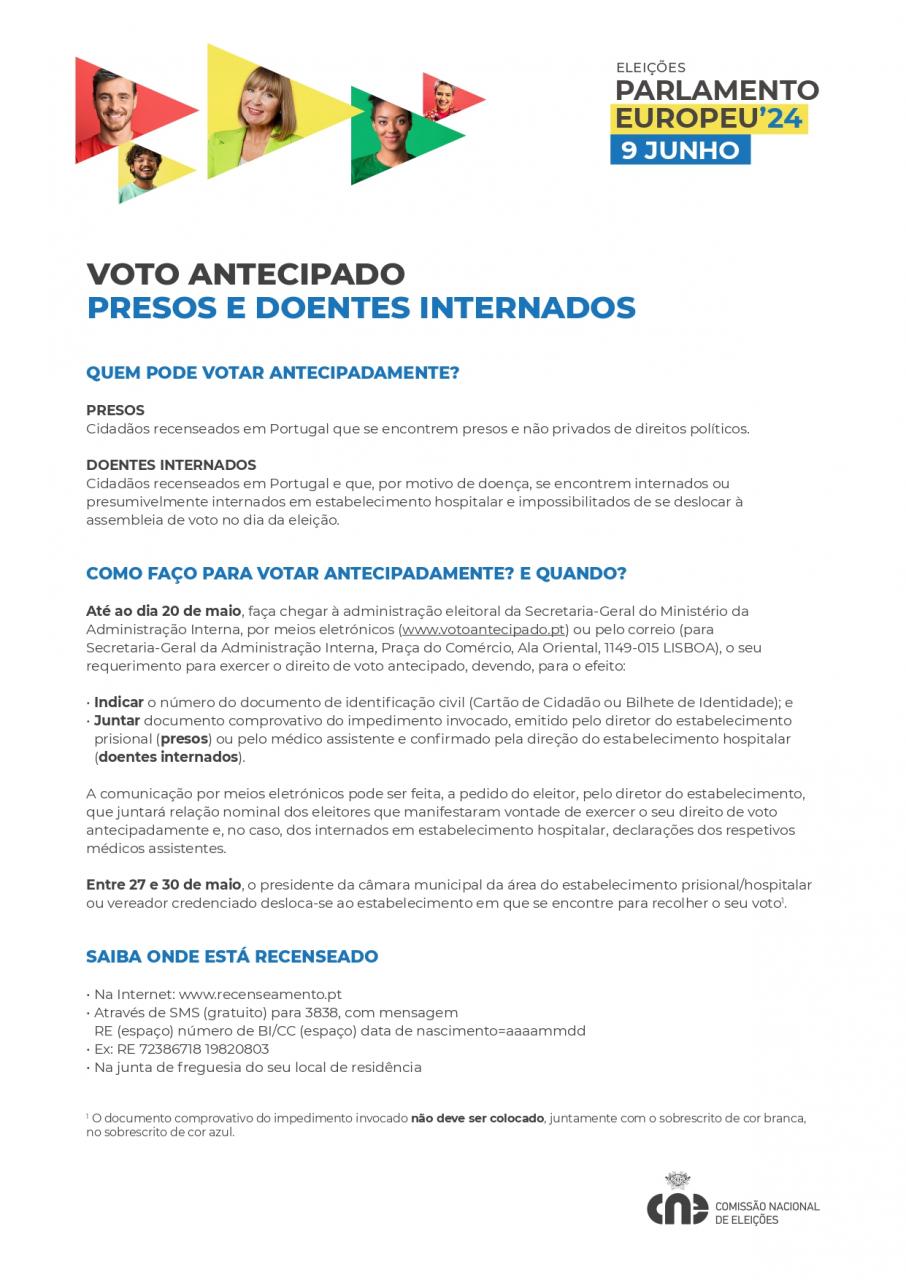 No âmbito das Eleições Europeias de 9 de junho de 2024, divulga-se os folhetos relativos ao voto antecipado.